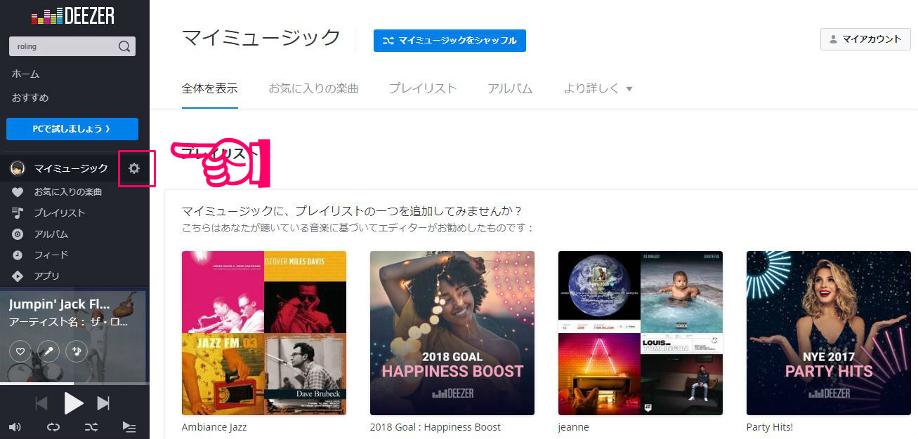まずはトップページの「マイミュージック」の横にある歯車マークをクリックします。