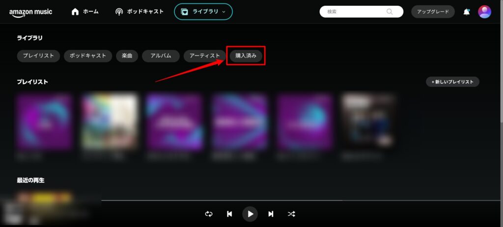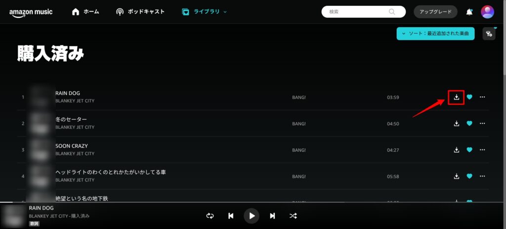 - 購入済みの曲の「ダウンロードのマーク」をクリック