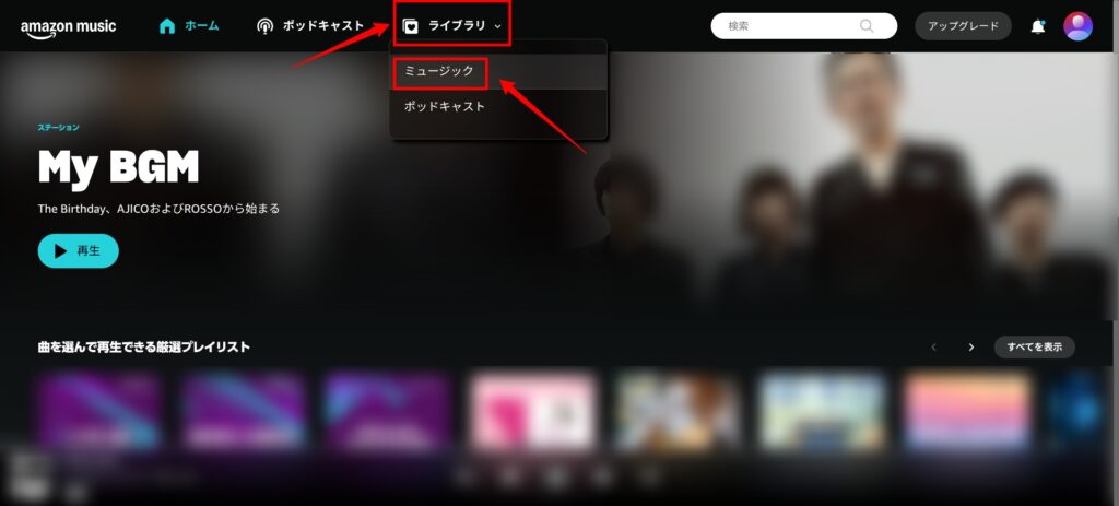 - サイト右上「ライブラリ」→「ミュージック」をクリック