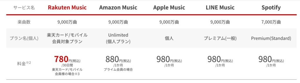 ですが、楽天カード/楽天モバイル対応プラン780円はあらゆる音楽サブスクの中でも最安です。
