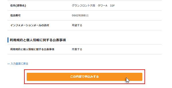 メールアドレス、氏名、住所などのお客様情報を入力して「「利用規約」「個人情報規約」に同意する」にチェックをいれます。