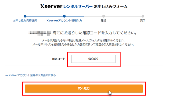 入力したメールアドレスに確認コードが届きますので、入力して「次へ進む」をクリック。